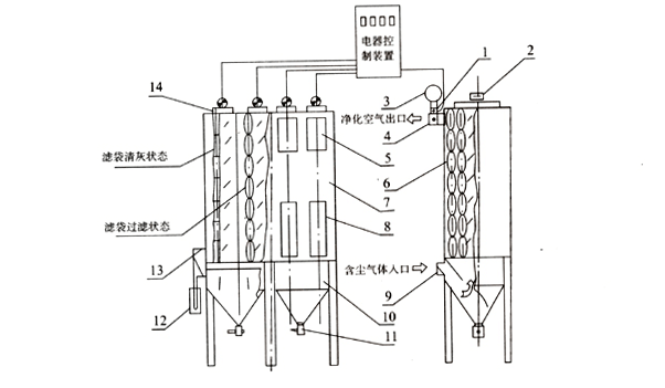 反吹空氣通過電動三通閥進入箱體后,與過濾狀態相比反向通過濾袋,與此同時,高頻電振器開始動作,使濾袋隨這作高頻震動。在反吹及高頻振動的同時作用下起到清灰的效果(清灰時間是可調的)。清灰結束時高頻電振停止振動。電動三通閥主閥板打開,付閥同時關閉,又恢復了正常過濾狀態。可以按照需要調整清灰的相鄰間隔時間、使各箱體按指定的時間依次序進行清灰。
